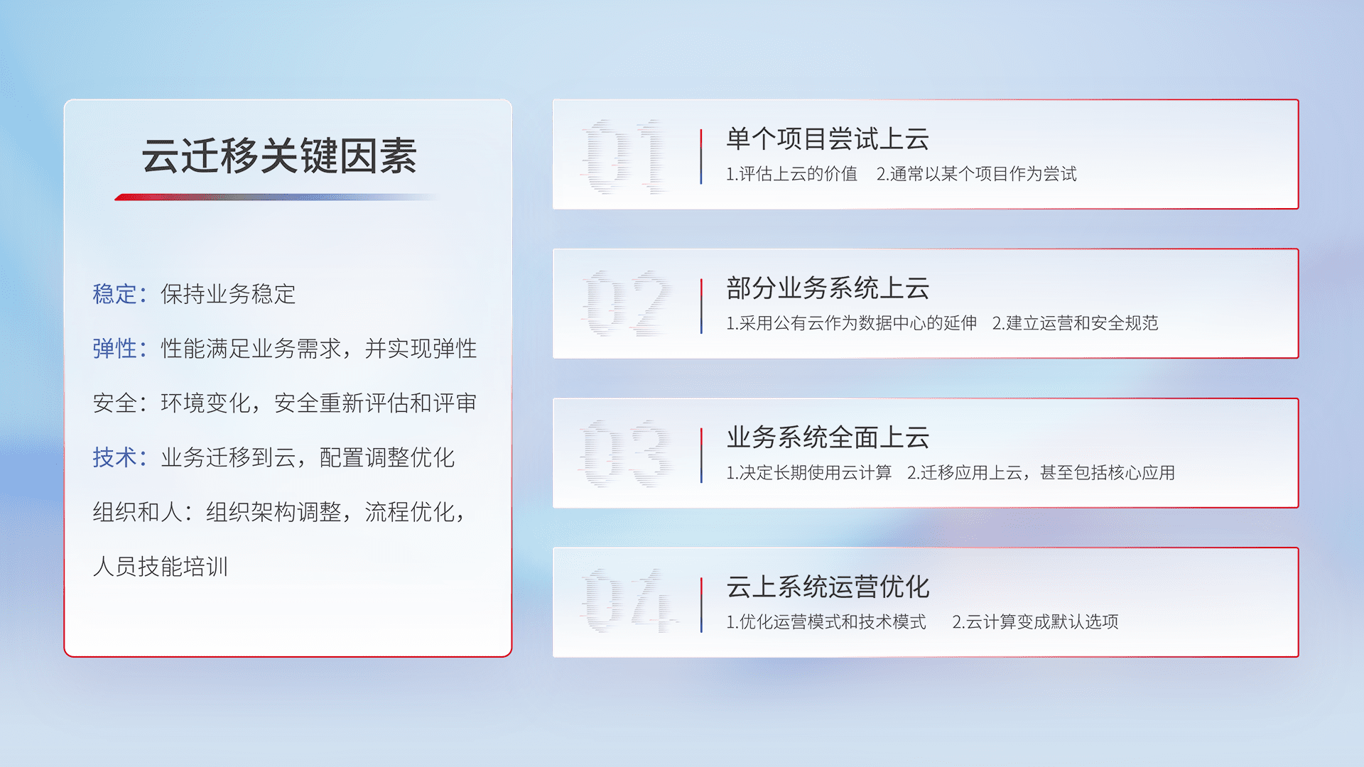 结合实际业务,,,从规划设计、、云平台选型、、、、云原生改造、、、、数据迁移、、、集成交付,,迁移全过程为客户识别最佳上云路径,,,做好风险识别管理,,设计网络架构、、身份权限、、安全审计合规、、、、操作审计、、、、日志审计、、、、监控告警策略、、、、多站点容灾设计等,,,对云上基础设施进行整体规划,,提升IT治理水平,,,,以满足弹性、、、高可用、、高性能的需求。。