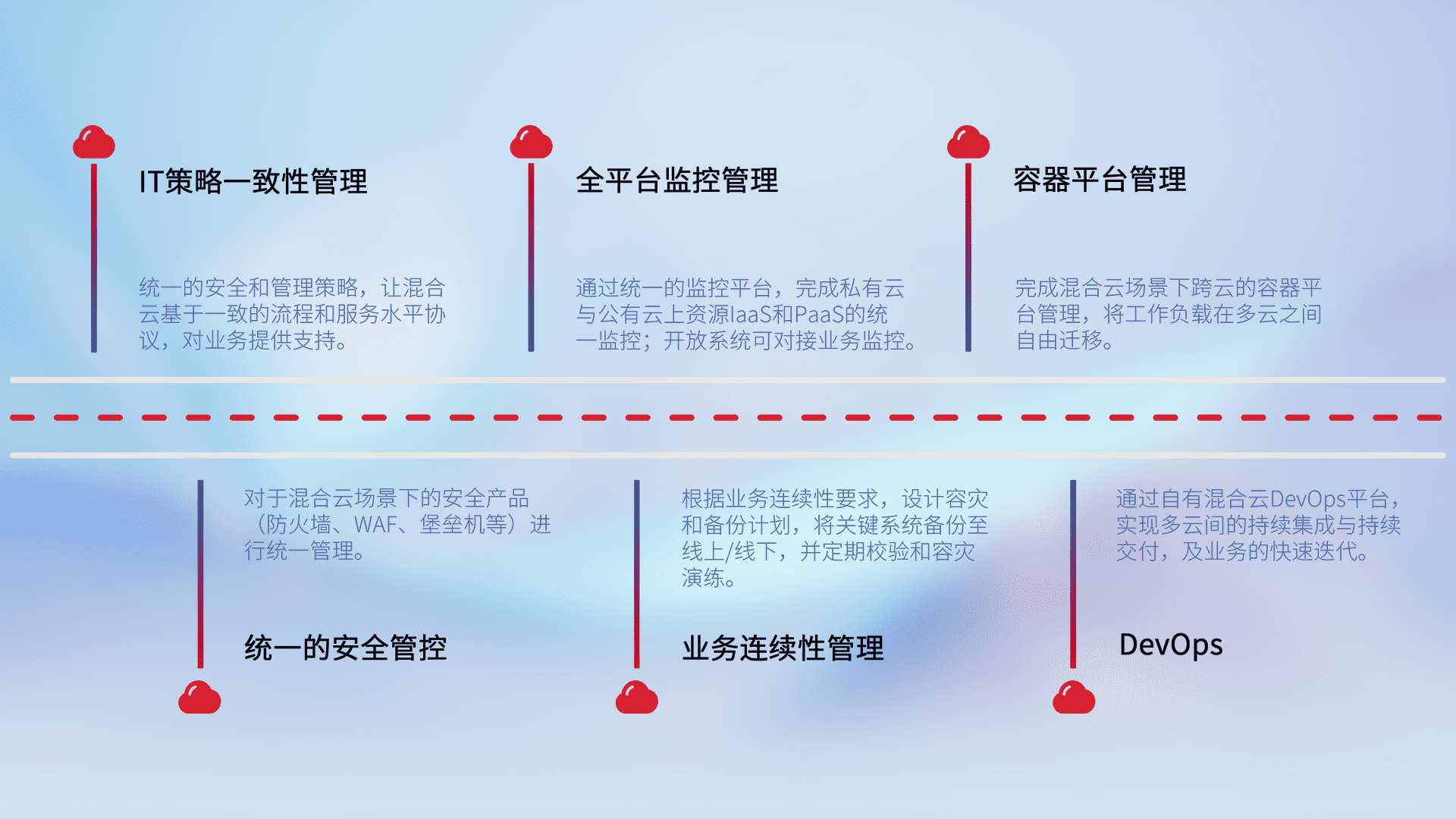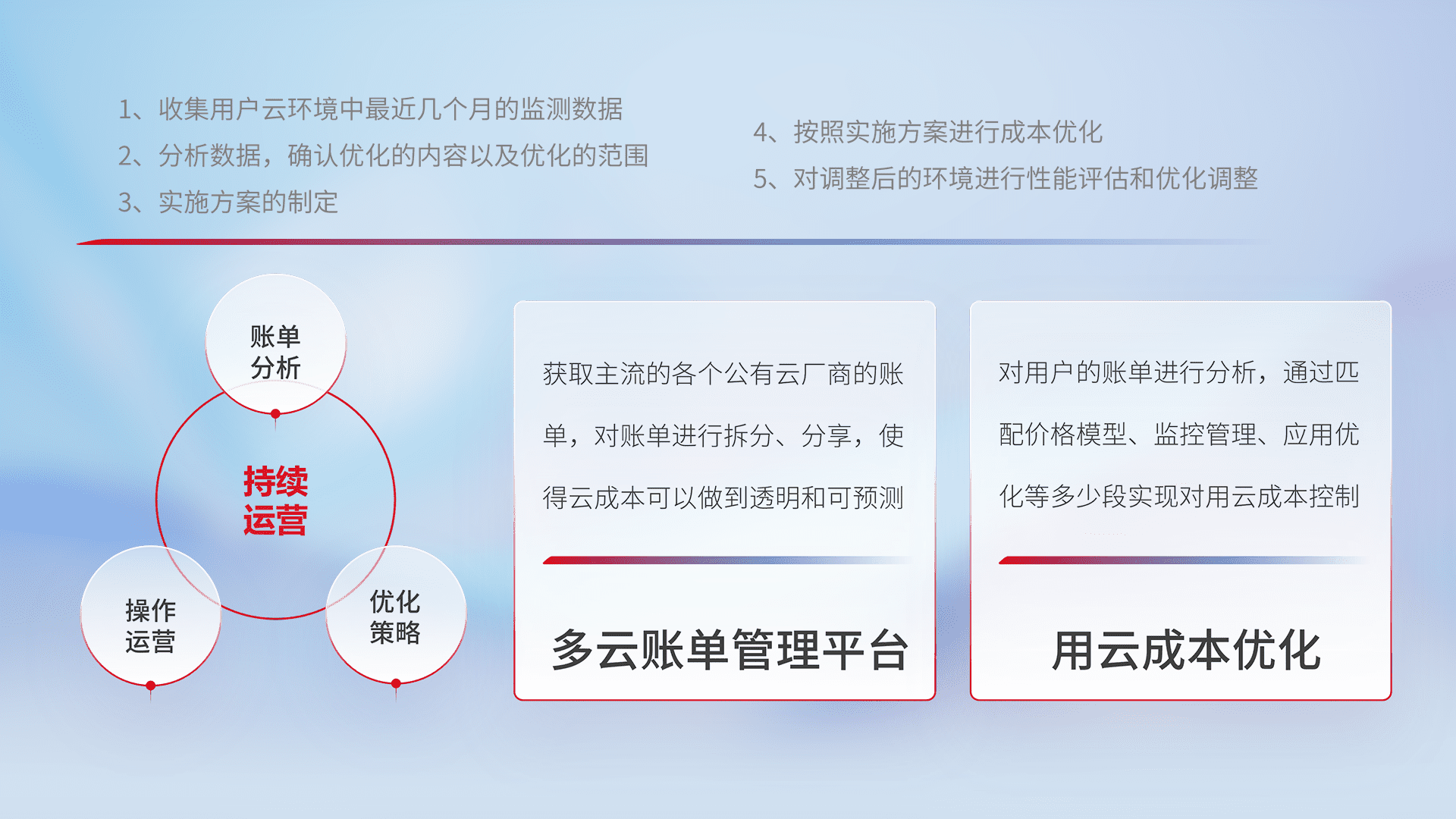 通过多云纳管,,,以统一的资源数据模型把客户的云资源进行抽象和封装,,,进而实现对多云资源的统一操作,,,,保障云资源管理的可靠性、、稳定性与可用性。。。量身定制化运维内容,,配置、、、开发运维、、、、补丁管理、、备份、、监控、、、认证和访问管理、、、、审计和日常巡检等,,保障在用云过程中的可靠度,,稳定度以及高可用率。。。。