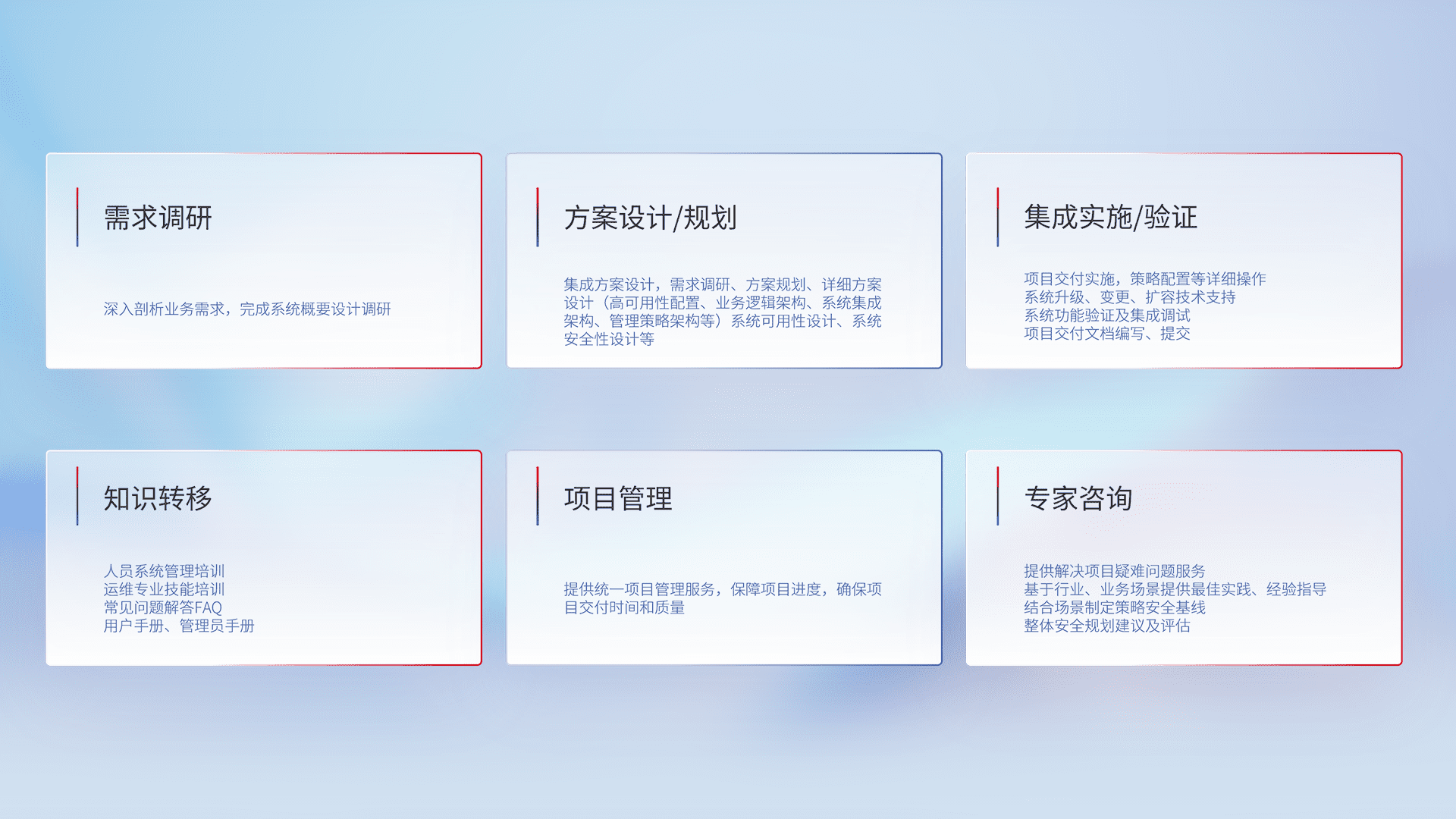 针对客户行业特性,,,将宏观的安全战略和需求,,,通过专业的交付服务,,,实现项目落地,,,为客户提供标准规范的集成交付服务。。