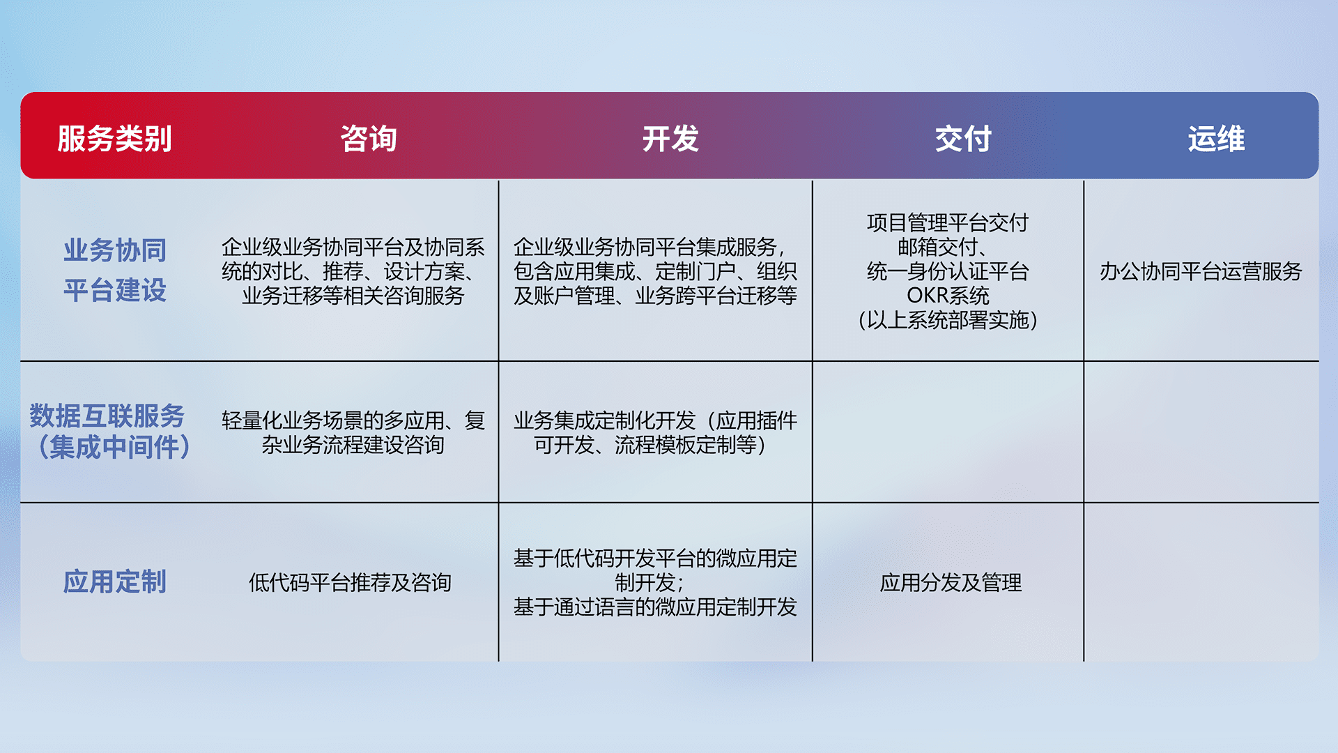 针对钉钉、、企微、、、IDaas等平台级产品提供产品的规划、、方案、、、交付、、定制化开发等服务,,,,实现如统一协同办公、、智能客户服务、、、混合会议管理、、、智能数据查询、、、、等业务场景,,实现数字化转型。。。